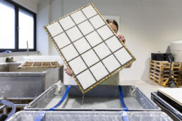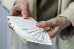 In der kleinen Papiermanufaktur in Süddeutschland wird handgeschöpftem Büttenpapieren Blumen-, Kräuter- und Gemüsesamen eingebettet, die nur darauf warten, zu sprießen und zu wachsen.